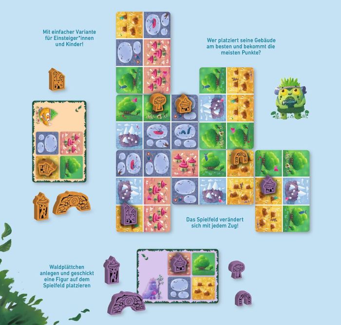 Create a magical forest! Place tiles, build your structures, and shape an enchanting woodland full of imagination! With simple rules, beautifully illustrated artwork, and charming wooden figures, this tile-laying game offers fun and strategy for the whole family. Who will grab the best building spots? And how can you benefit from the tiles placed by others? Find out as you step into the role of a mystical forest creature.